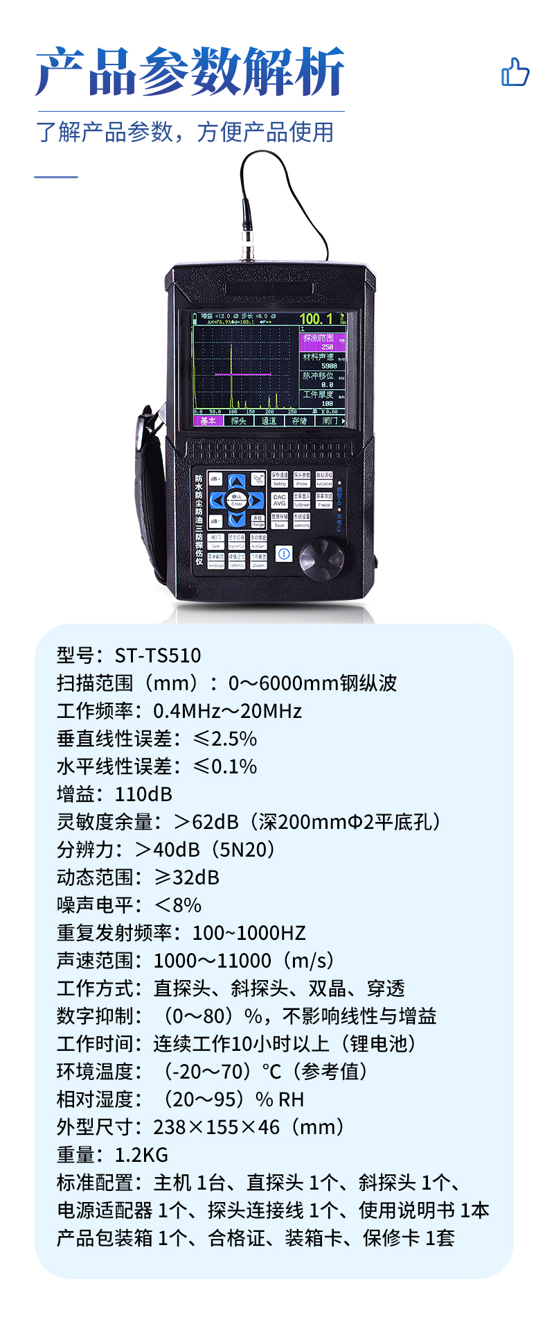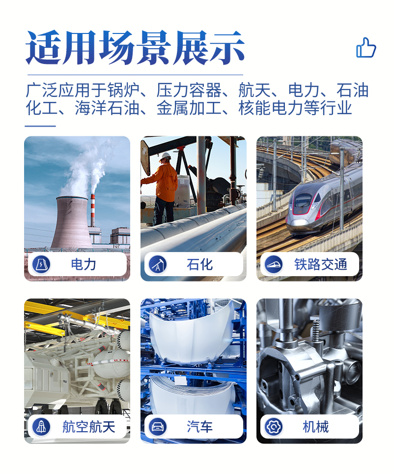 便携式超声波探伤仪能够快速便捷、无损伤、准确地进行工件内部多种缺陷如裂纹、焊缝、气孔、砂眼、夹杂、折叠等的检测、定位、评估及诊断,广泛应用于电力、石化、锅炉压力容器、钢结构、航空航天、铁路交通、汽车、机械等领域。它是检测行业的重要仪器。