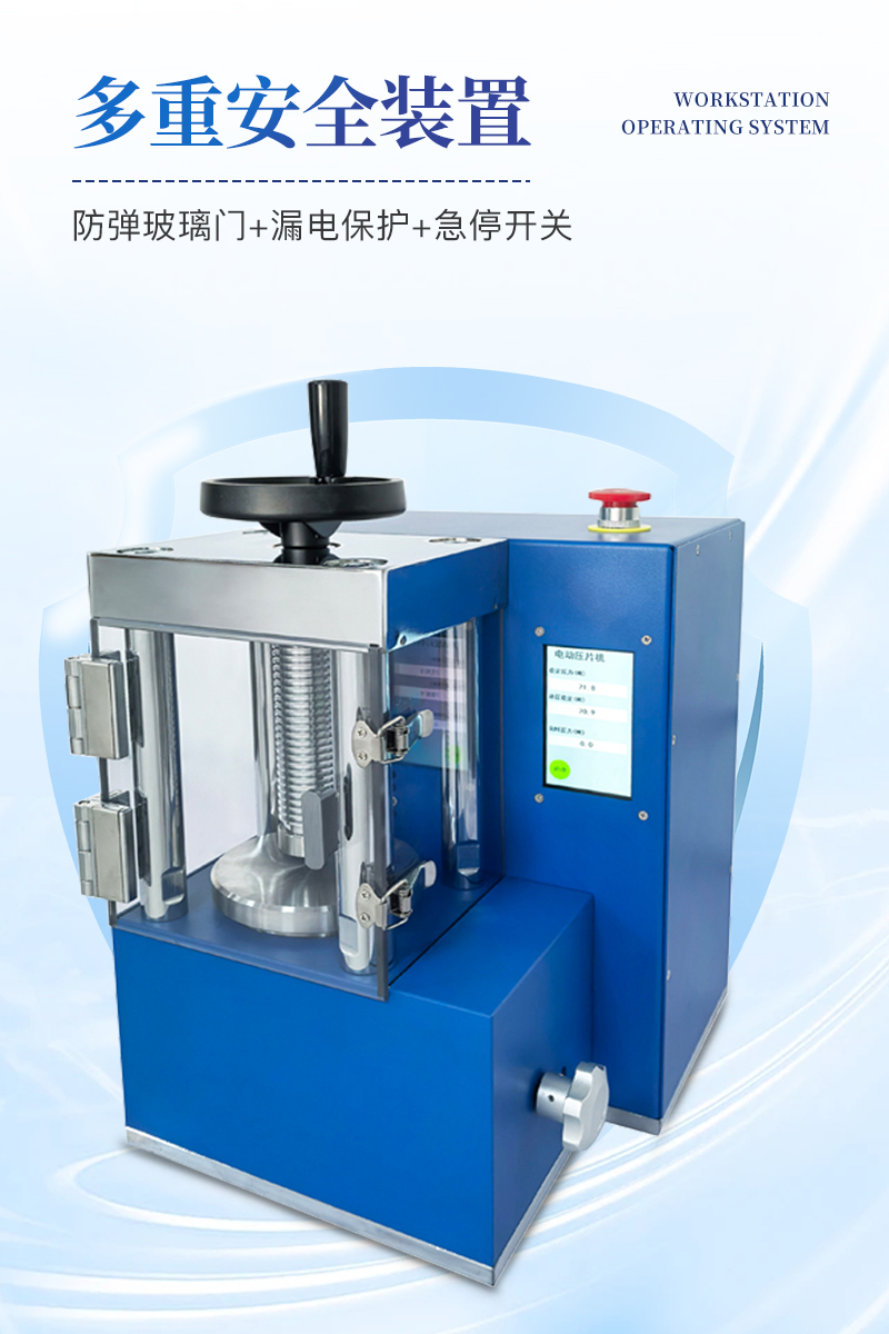 电动压片机该机相比手动压片机,工作效率大大提高,4.3寸触摸液晶屏直接显示压力吨位;配以特定模具,可将各种粉末样品压制成试片用于科学研究分析检测等,也可作为普通压力机使用,应用极其广泛。