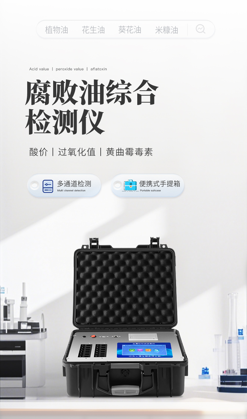 食用油综合检测检测仪为集成化油品快速检测分析设备,能够快速检测食用植物油、食用猪油、花生油、葵花油、米糠油、食品、肉制品中的酸价、过氧化值、黄曲霉毒素、丙二醛等含量;通过检测可确定植物油是否符合国家标准或是否为酸败油、劣质油、地沟油等。仪器预留其他项目检测程序和端口,根据日后需求可方便的自主增加检测项目。日后可升级为检测水产品、面制品的综合类型仪器。