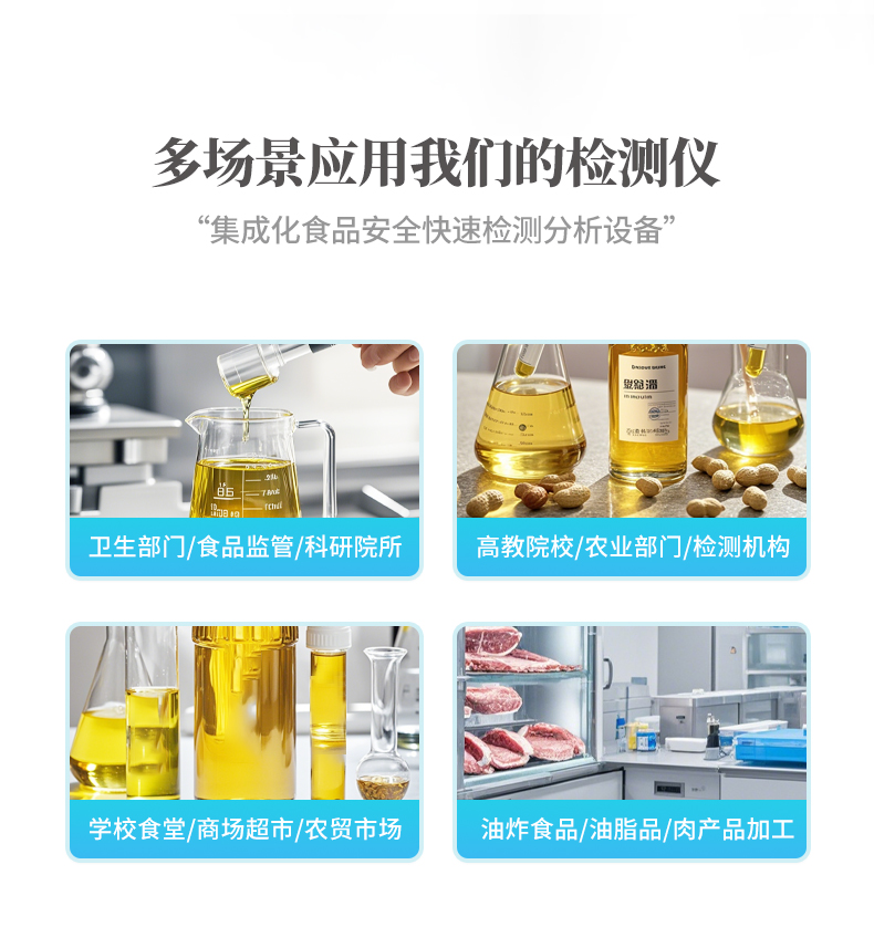 广泛应用于质量监督检验、工商管理、油炸食品生产基地、食药监局、卫生部门、肉制品食品深加工企业、农业部门、检验检疫部门、商场超市、各大食品安全监测系统等单位使用。
