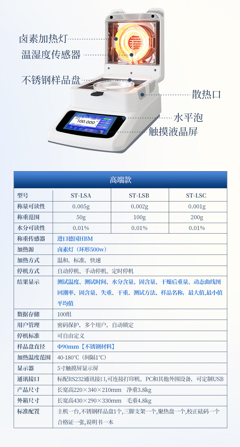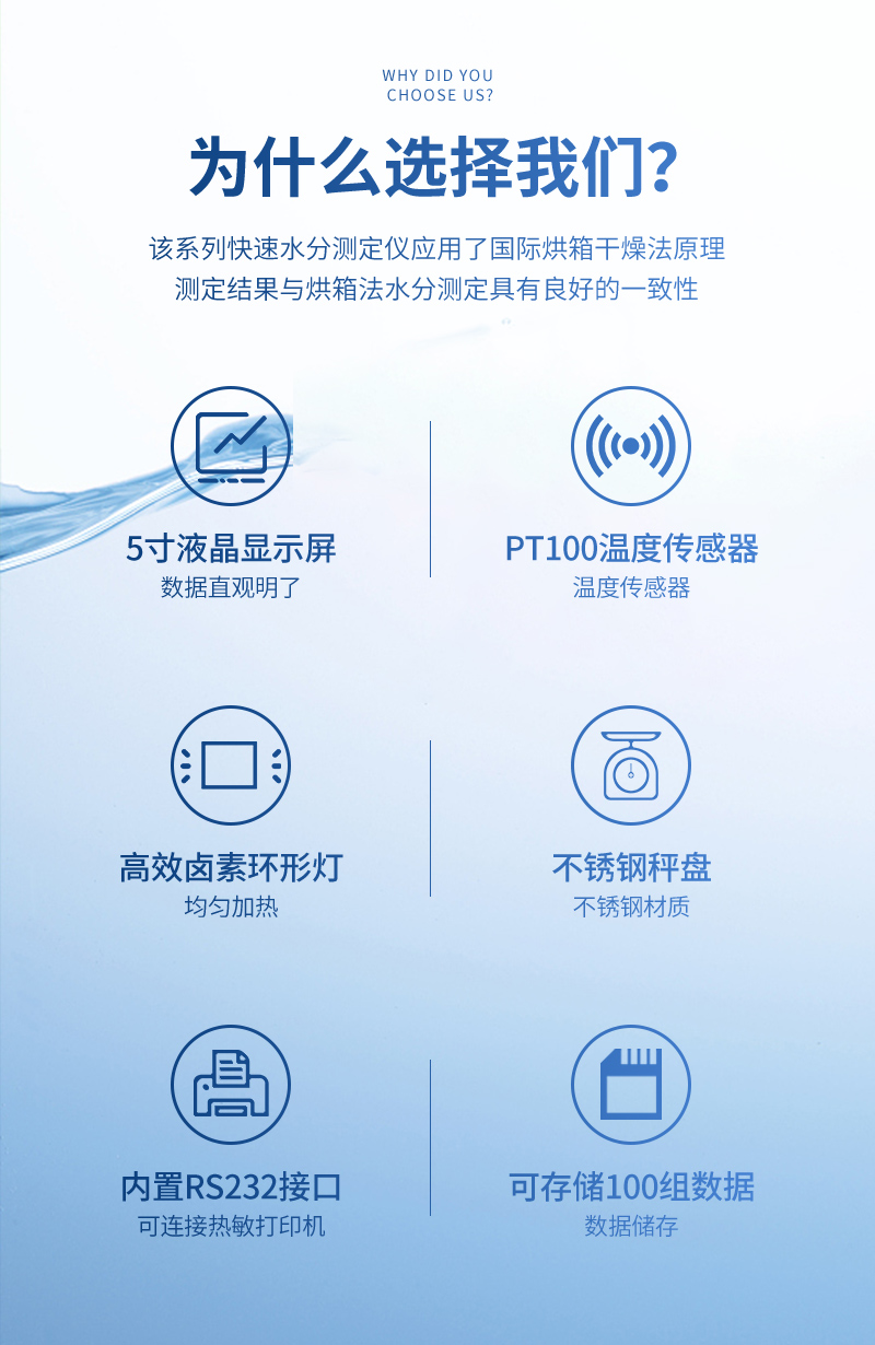 该系列快速水分测定仪应用了国际烘箱干燥法原理,测定结果与烘箱法水分测定具有良好的一致性,工作效率却远远高于烘箱法水分测定,一般样品只需要几分钟即可测量完毕,因此受到广大用户的青睐与好评。