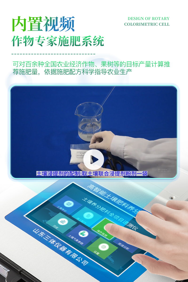 配套齐全:该仪器集药、器、仪为一体,携带方便,相当于一个小型移动实验室,无需用户自配附件,亦可灵活野外流动测试。适于农业服务部门或农资经销商、合作社、肥料厂商、大种植户测土施肥和鉴别肥料真假。
