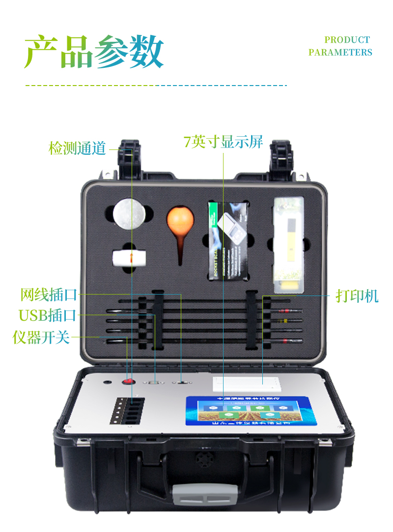 配套齐全:该仪器集药、器、仪为一体,携带方便,相当于一个小型移动实验室,无需用户自配附件,亦可灵活野外流动测试。适于农业服务部门或农资经销商、合作社、肥料厂商、大种植户测土施肥。