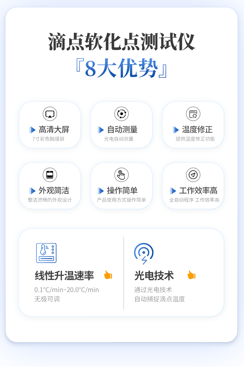 本仪器采用全电脑控制,全自动测量,通过光电技术,自动捕捉滴点温度。
